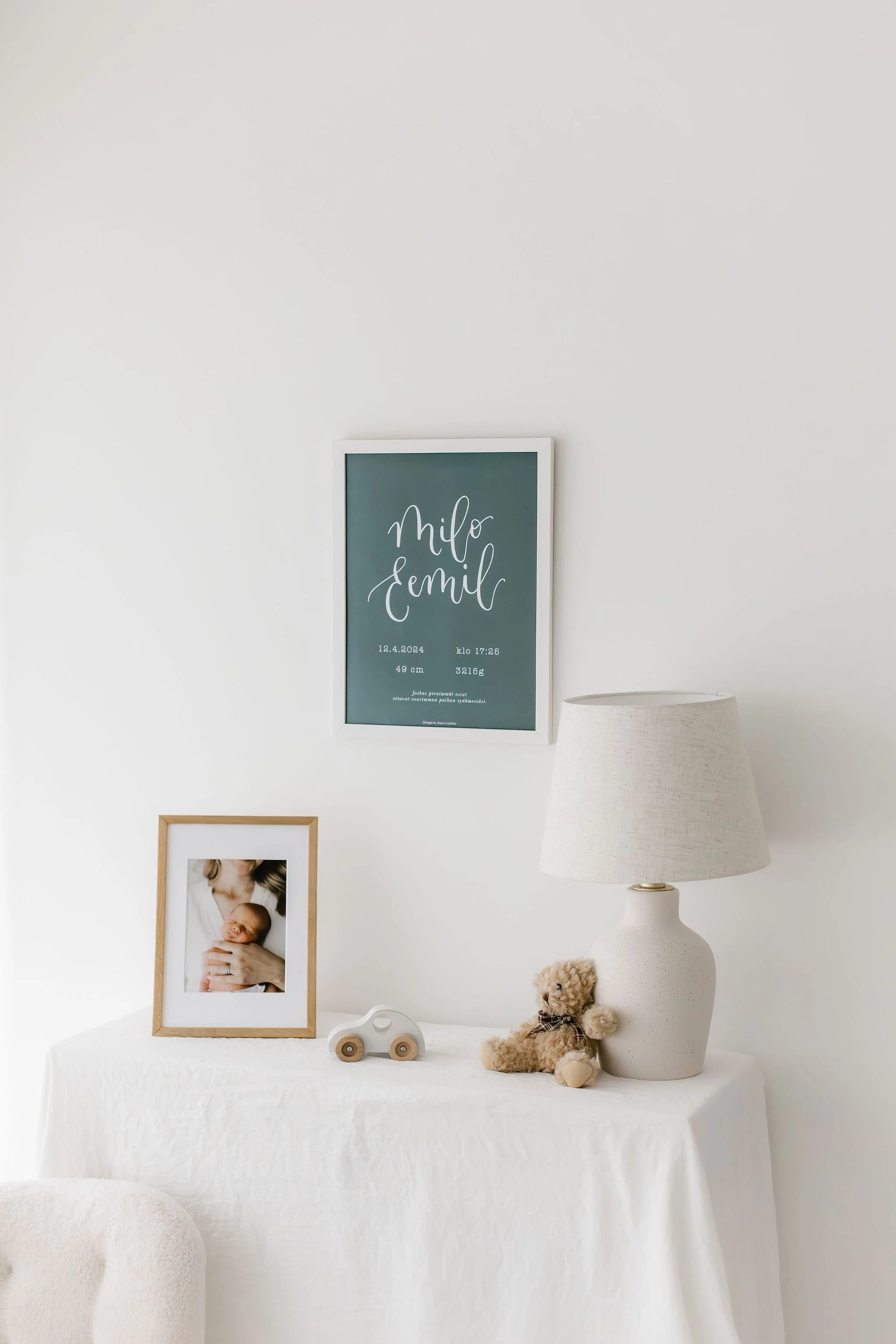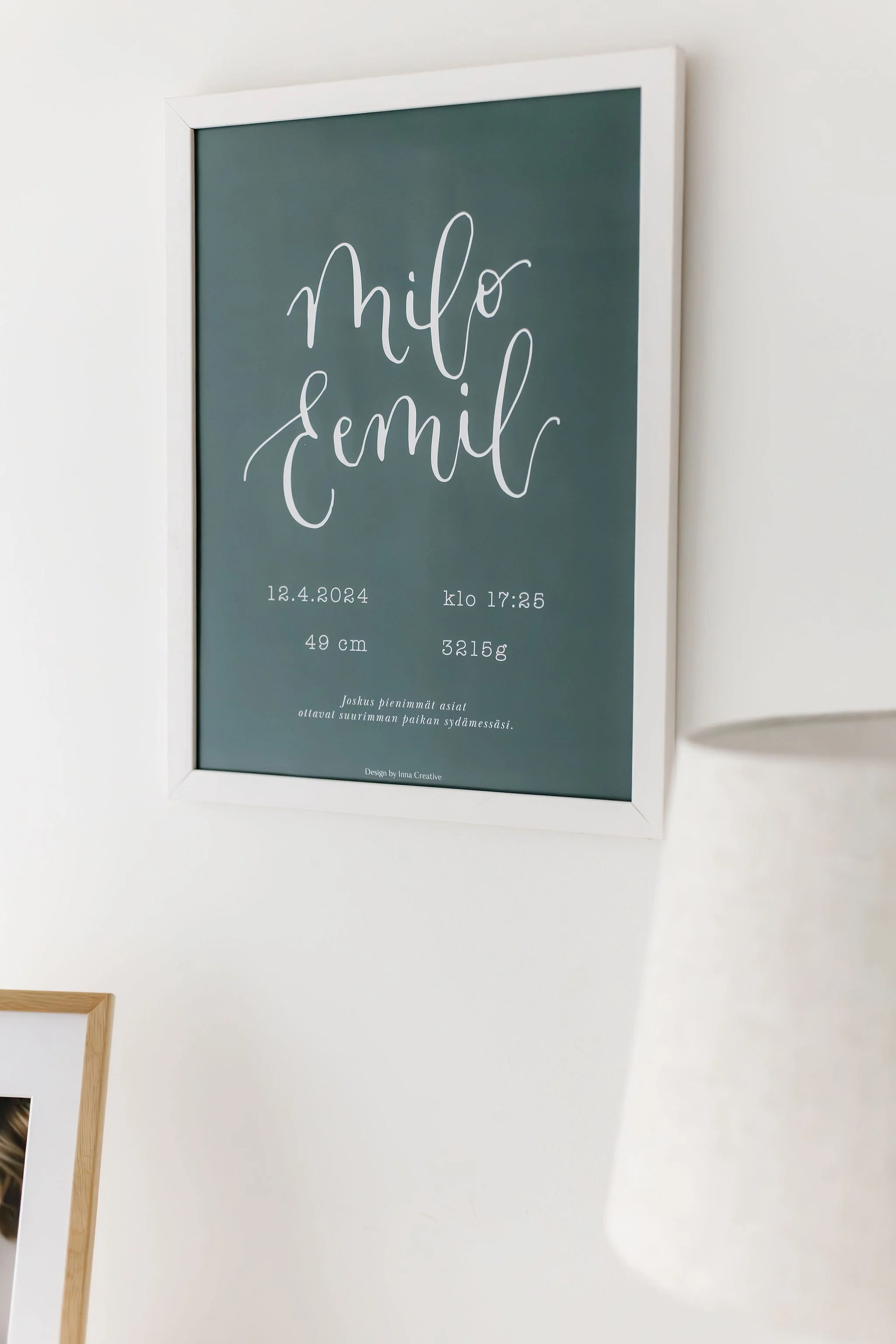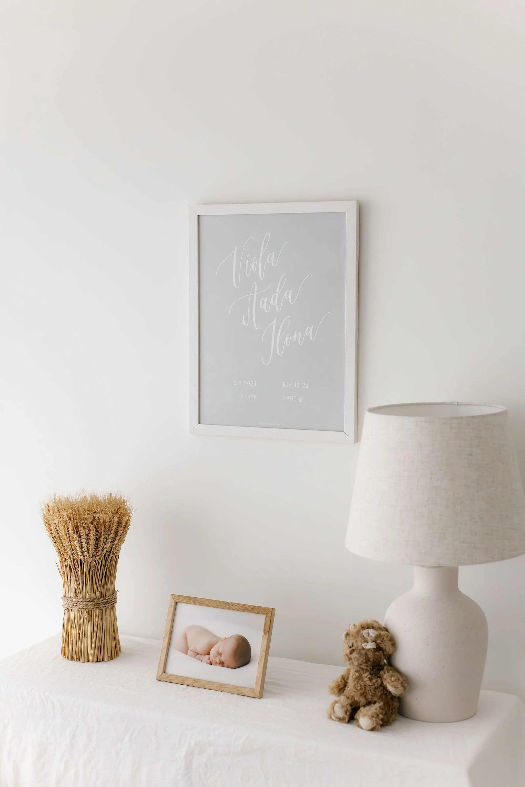 Syntymäjuliste on kiva idea nimen julkistamiseen ristiäisissä tai sosiaalisessa mediassa. Taulun voi toteuttaa esimerkiksi ristiäisissä myös siten, että taulun antaja antaa