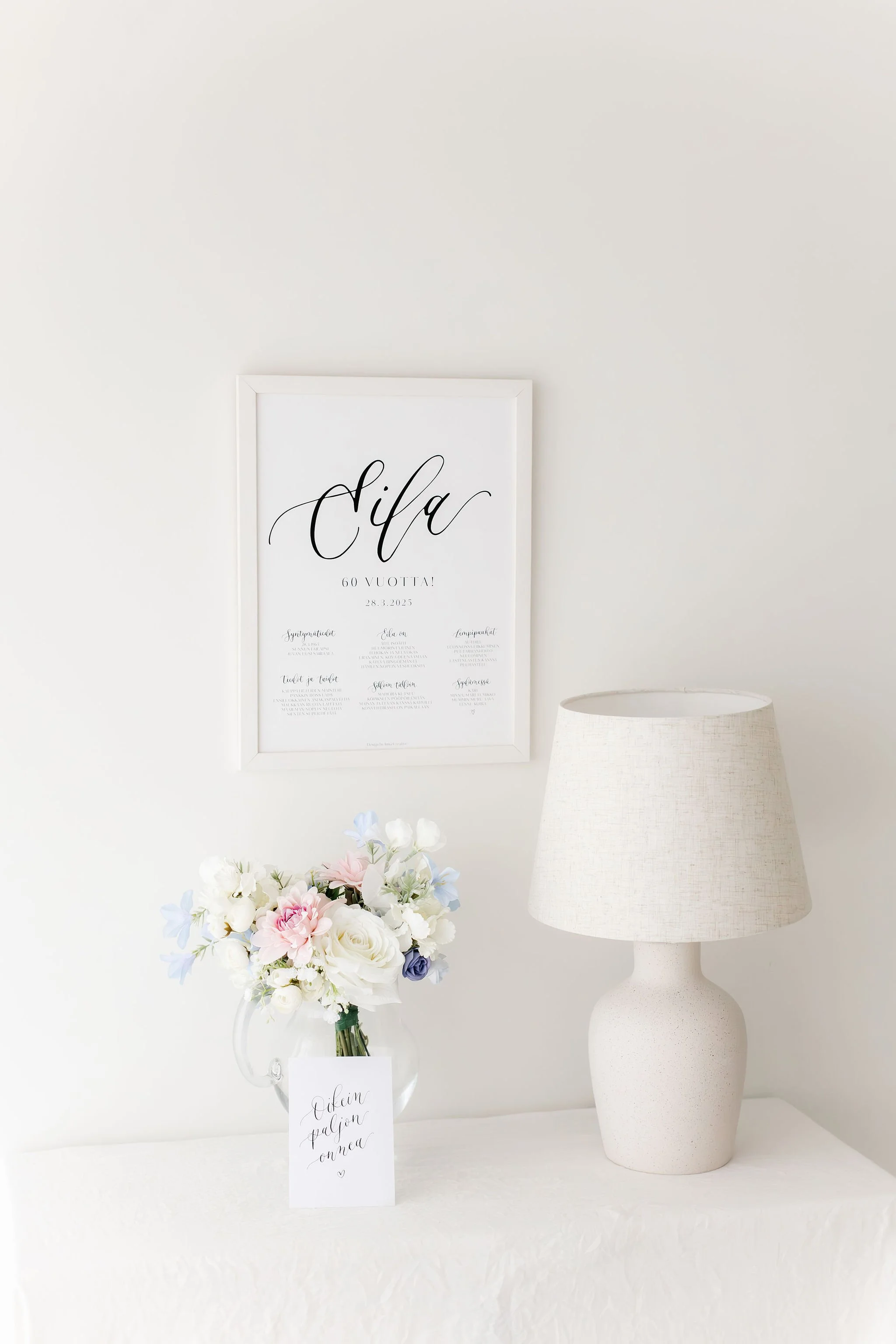 “Olen tilannut Annilta useita kustomoituja synttärijulisteita, joihin on saatu lahjan saajan persoonaa hyvin ilmaistua. Olen tilannut näitä erityisesti 50-60 -vuotislahjoiksi ja keksin tauluihin uudet aikuisille sopivat otsikot. Taulun tekstin sommittelu oli kaunis. Erityisesti ilahduin kauniista kehyksistä ja lahjarusetista, sekä lahjakassista. Koko setti tuli hyvin toimitettuna kotiin asti. Taulun saajat pitävät kaunista taulua näkyvällä paikalla.”